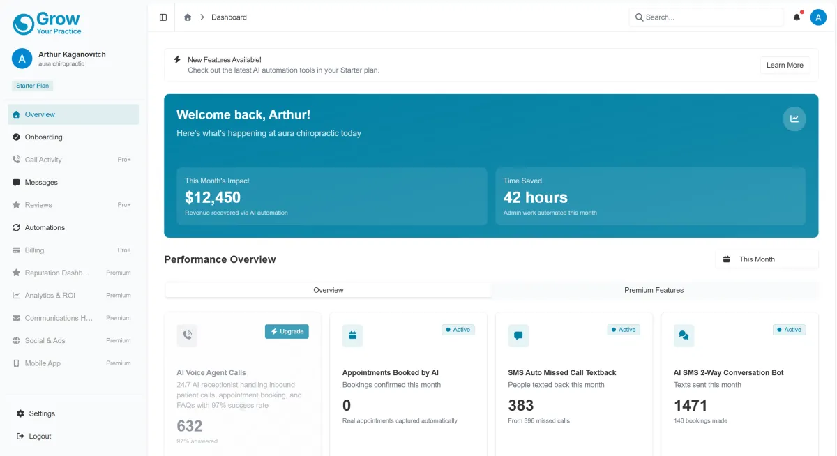 "GrowYourPractice texts back missed calls in seconds and the AI books them straight in. Recovered bookings now pay for the system twice over."